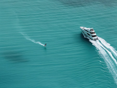 A white yacht cruises through the clear turquoise water, leaving a foamy wake behind as a lone water skier cuts through the waves.