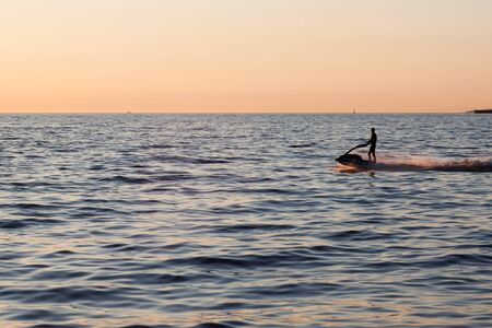 man drive jet ski at sunset.