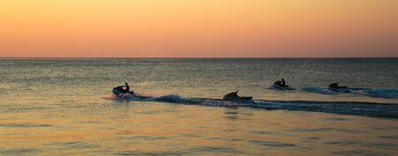 Racing on water scooters at sunset