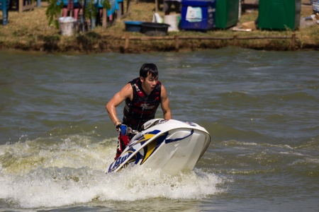 SARABURI THAILAND-JANUARY 20: Sonswut Rappasubpisan in action during show Freestyle the Jet ski stunt action on Jan 20, 2013 in SARABURI,Thailand.