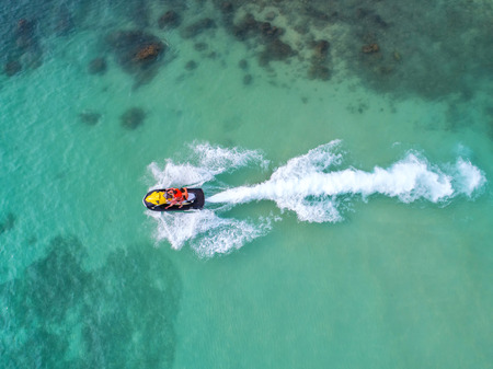 People are playing a jet ski in the sea.Aerial view. Top view.amazing nature background.The color of the water and beautifully bright. Fresh freedom. Adventure day.clear turquoise at tropical beach.