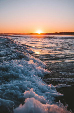 A breathtaking view of a sunset casting warm hues over the ocean, highlighting gentle waves with foam. The scene evokes feelings of peace and tranquility in nature.