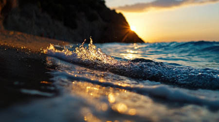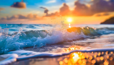 A low angle view of a turquoise sea wave breaking on a sandy beach. The setting sun in the background creates a warm, serene and tranquil atmosphere.