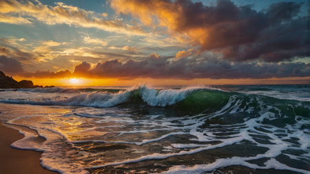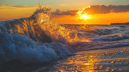 Powerful ocean wave curls and breaks on the sandy beach at sunset creating a dramatic scene Perfect for coastal and nature themes.