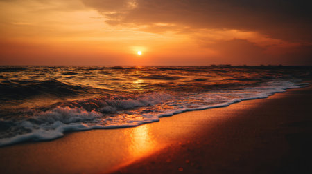Sunset over water, waves splashing on sand generated by artificial intelligence