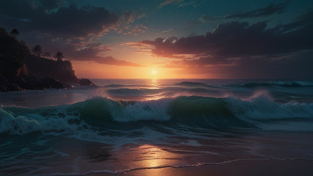 AI Generated. A beach with waves and a sunset Background