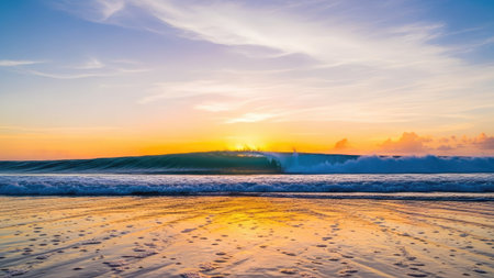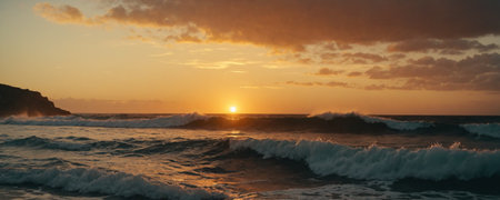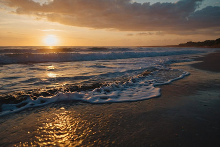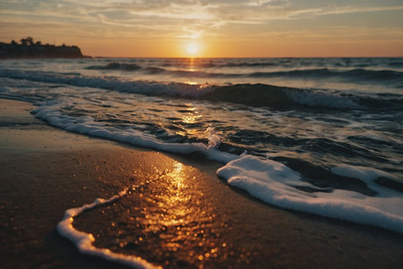 A stunning view of tranquil ocean waves reflecting a golden sunset, creating a serene atmosphere. The beautiful scenery captures the beauty of nature and peace.