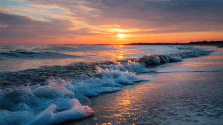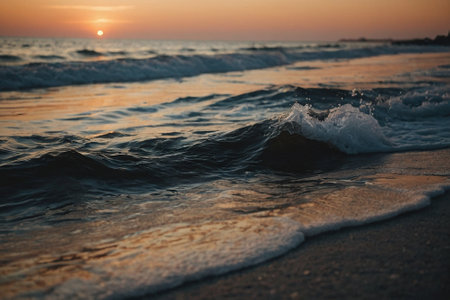 Discover the beauty of ocean waves crashing gently on a sandy beach at sunset, creating a tranquil scene that evokes relaxation and peace.