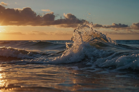 The image features an ocean scene with waves illuminated by sunset light. The composition highlights the water's movement and the sky's colors. The image suggests a peaceful atmosphere suitable for various visual communication projects, offering a sense of calm and natural beauty without specific location references.