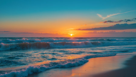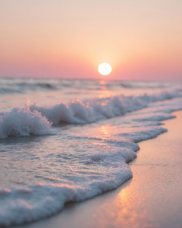 Serene beach sunrise with gentle ocean waves, calming seascape. Nature tranquility and relaxation concept