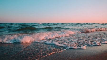 Soft rolling waves embrace the shore as the sun rises, painting the sky in pastel hues, evoking a sense of tranquility and serenity near the ocean.