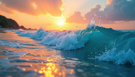 Powerful ocean wave curls and breaks on the sandy beach at sunset creating a dramatic scene Perfect for coastal and nature themes.