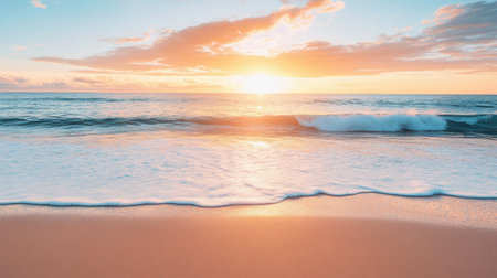 Serene beach sunrise with gentle ocean waves, calming seascape. Nature tranquility and relaxation concept
