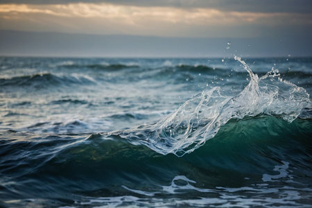 Experience the serene beauty of ocean waves at sunset, featuring glimmering water droplets and vibrant colors as the sun dips below the horizon.