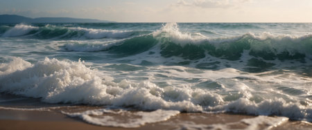 A mesmerizing scene of foamy ocean waves gently rolling toward the shoreline, illuminated by warm sunlight, showcasing natures rhythm, fluidity, and timeless allure in a harmonious seaside