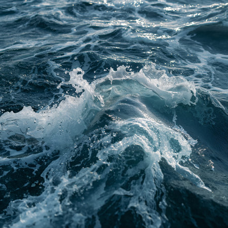 Deep blue ocean water with swirling waves and splashes. Top view of vibrant seascape with sea water