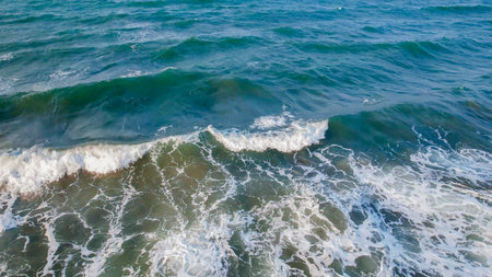 Top view ocean waves turquoise coast. Blue waves hit sandy shore from above, perfect for marine landscape photos.