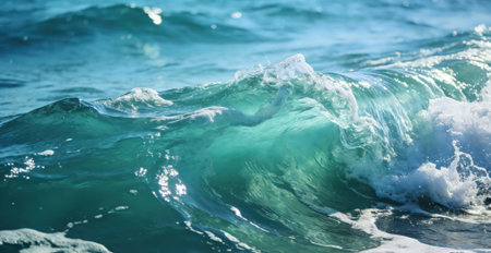 A captivating image of a rolling ocean wave, showcasing the powerful and serene beauty of the sea. The wave's crest is white and foamy, contrasting with the deep blue-green color of the water. The image captures the dynamic motion and energy of the ocean as the wave crashes forward.