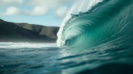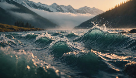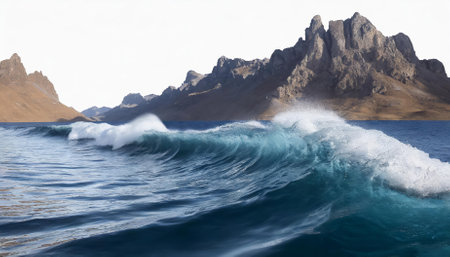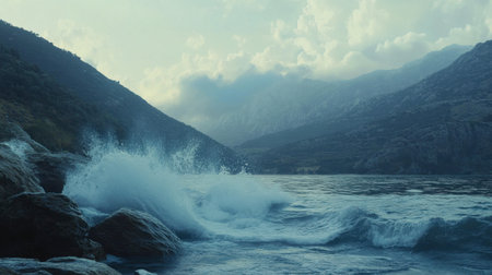 An AI generated illustration of a tranquil ocean scene with large splashing waves