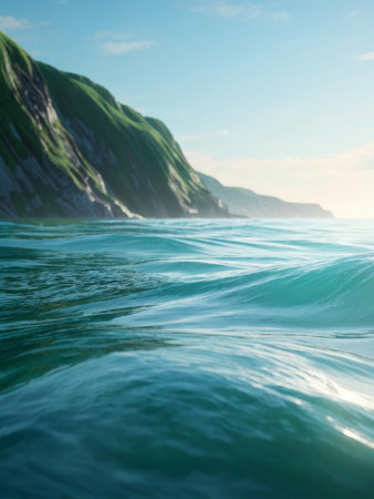 Calm ocean waves gently ripple under the warm sunlight, creating beautiful reflections on the water's surface near a picturesque shoreline. Perfect for summer vibes.