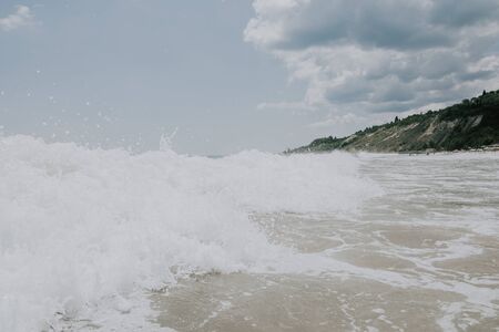 This captivating image showcases foamy waves rolling up the ocean shoreline under a brilliant sky, illustrating natures beauty and the soothing yet dynamic power of the sea as it endlessly meets