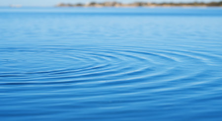 Captivating close-up of serene water surface with tranquil ripples in stunning blue tones. Light reflections create a beautiful sense of calm and harmony.