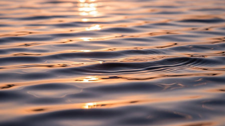 This image features a serene water surface showcasing gentle ripples and reflections of warm sunset colors. Ideal for themes related to nature and relaxation.