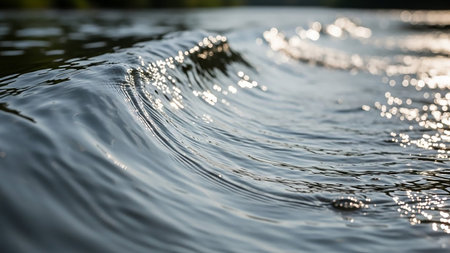 Close-up of gentle ripples on a calm water surface with soft, diffused light. Clear details and vibrant colors...