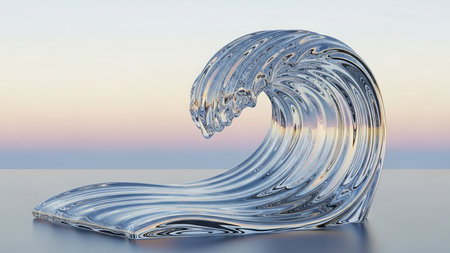 A sculpted wave shape made of transparent glass with reflections of pastel sky colors on a reflective surface.