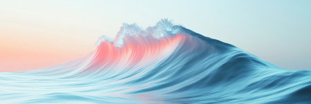 A powerful ocean wave curls gracefully against a pastel gradient backdrop, showcasing shades of pink and blue during sunset.