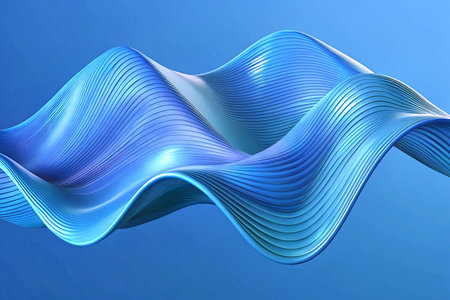 An abstract composition features a flowing wave-like structure composed of numerous parallel lines. The image showcases a blend of cool colors, predominantly blues and whites, with a subtle gradient effect. The design suggests a digital or scientific context. Suitable for graphic design or conceptual presentations.