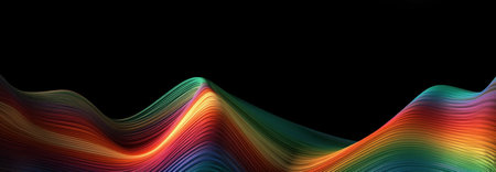 Rainbow spectrum wavy smooth lines abstract pattern design on black background with copy space. AI generative illustration.
