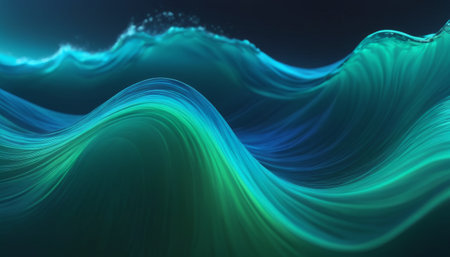 A captivating abstract image featuring flowing waves created with a digital mesh structure, showcasing vibrant hues of green and blue against a sleek black background.