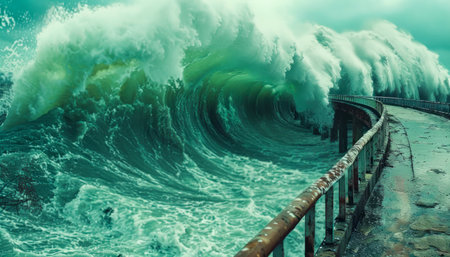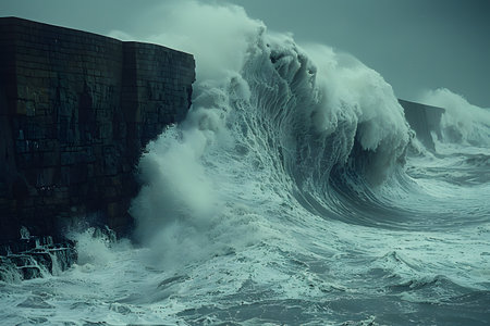 Massive ocean waves collide with a tall sea wall during a powerful storm. the dramatic scene highlights the force of nature and serves as a critical reminder of coastal erosion and climate change impacts on marine environments. Generative AI