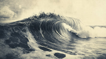 A powerful wave curls over, showing intricate textures and patterns in black and white. The intensity of the water creates a captivating and dynamic visual effect.