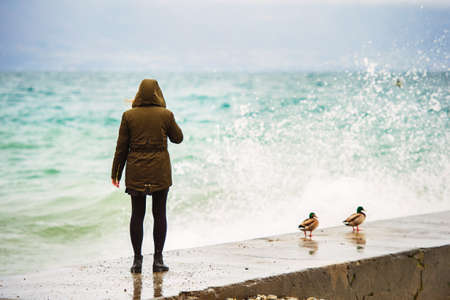 Young woman watching storm over lake Geneva, Switzerland