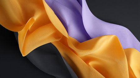A vibrant abstract image of flowing fabric in yellow, purple, and black hues