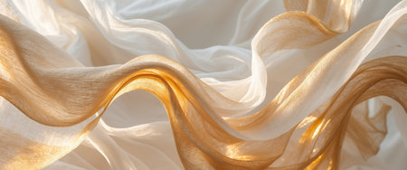 An ethereal fabric is captured in motion, illuminated by sunlight. The flowing material displays soft textures and a range of cream and white hues. The composition and lighting create an abstract and dynamic visual, suitable for various design applications and commercial purposes.