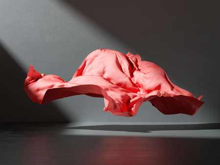 3d render. Abstract fashion background with red fabric cloth falling on the floor inside the dark room illuminated with ray of light. Silk drapery is blown away by the wind
