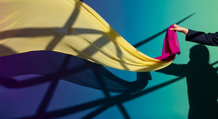 Close up of woman hand pulling yellow cloth over colorful background with shadow