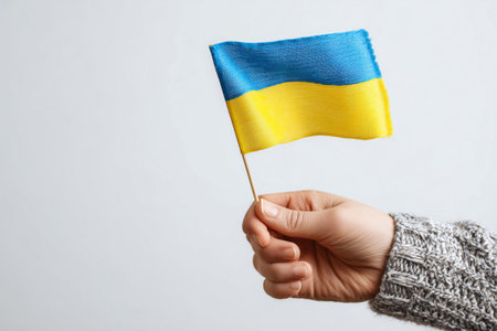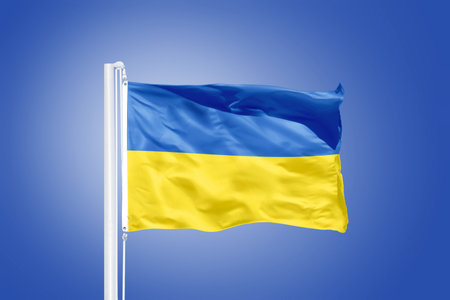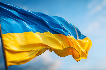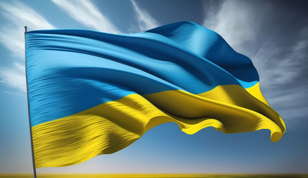The Ukrainian flag, with its vibrant blue and yellow colors, waves gracefully against a bright white background. This striking display symbolizes national pride and resilience, capturing the essence of Ukraine's identity. The colors represent the sky and fields of wheat, reflecting the beauty of the nation.