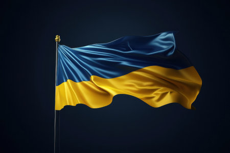 3D render of the yellow and blue flag of Ukraine flying on a dark background, a banner design. The Ukrainian national symbol is depicted in the colors of its official coat of arms. It's an elegant, dynamic image that captures attention with its vibrant color contrast. This flag print can be used for various creative projects or as an element to convey information about Ukrainian culture and history. Commercial photo, soft light, high quality, sharp focus, professional lighting, photography style, depth of field, incredibly detailed, sharpened details, 50mm lens, full body shot. --ar 3:2 --v 6.1 Job ID: 10850cc6-9cf9-4638-8c09-cbdf7e5acfd8