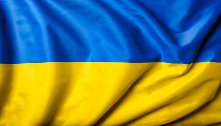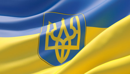 Close-up view of a waving Ukrainian flag with its vibrant blue and yellow colors and the golden trident coat of arms, depicting Ukrainian pride and heritage.