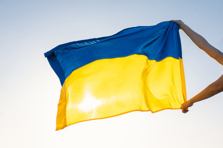 Ukrainian flag waving in wind and sunlight. Flag of Ukraine on blue sky background. National symbol of freedom and independence.