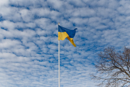 Ukrainian yellow and blue flag flying on blue cloudy sky background with tree btanches.
