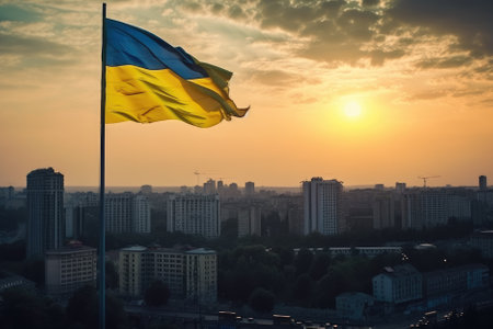 The flag of Ukraine waves proudly in a big city at sunset, symbolizing the country's freedom, unity, and resilience. The warm hues of the sun create a beautiful backdrop for the flag, highlighting its bold colors and creating a sense of hope and optimism for the future. Generative AI