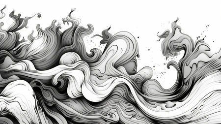 Delicate swirling patterns with smooth curves and intricate designs fill the space, showing a beautiful interplay of black and white tones in a stylish, artistic composition.