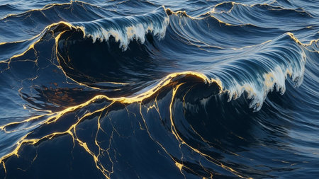 Dark blue ocean waves with intricate golden filigree patterns decorating their crests create a dramatic and artistic...