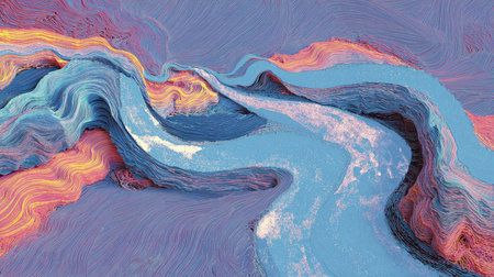 An abstract artwork showcases flowing swirls of blue and purple hues, accented with lighter shades. The composition features a textured appearance, creating a visually dynamic design. This image evokes fluidity and movement suitable for various design applications, potentially for decorative and editorial purposes.