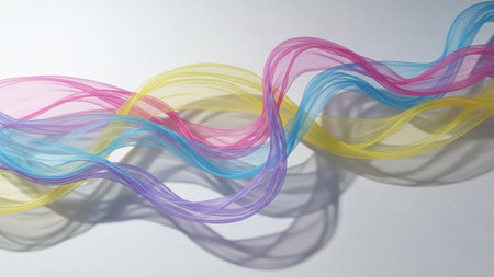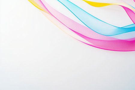 A beautiful translucent ribbon dances through the air, displaying vibrant pastel colors of blue, yellow, and pink. Ideal for creative projects.